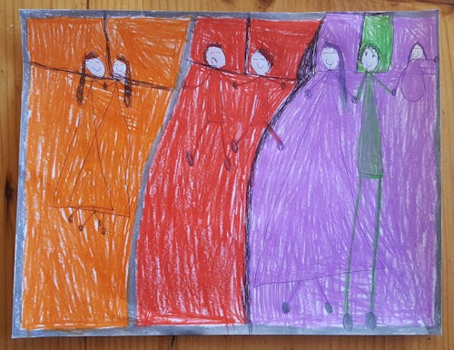 As she creates these drawings, she is telling herself the story. Her characters might appear simple on the page (she’s not a masterful drawer), but to her, they are full of life and action. One page is not merely a scene in a story: It is alive with purpose and emotion, both happy and sad. Watching her draw (and become alive in her stories) is sometimes so intimate and endearing that I have to fade to the background, lest I intrude on what rightly belongs to her.